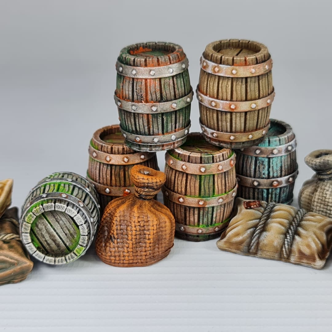 This set of high-quality STL files provides a fantastic assortment of Cargo Props, perfect for adding detail and gameplay elements to your tabletop scenes. Each model, from the sturdy wooden crates and barrels to the rustic sacks and bundles, features crisp, authentic textures like wood grain and cloth weave that come to life once printed. The models are expertly scaled for 28mm and 32mm wargames and RPGs, making them compatible with a vast array of popular systems. Designed for exceptional results on both FDM and Resin 3D printers, these props print beautifully, providing you with durable and detailed scenery. Use them as line-of-sight-blocking cover, objective markers, or simply as immersive scatter to flesh out your docks, warehouses, bandit camps, or medieval town squares.
